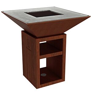 Le Brasero grill Vulcanus Pro730 Chef vous permettra de convier vos invités autour de son socle, qui offre en plus un espace de rangement. Vous pourrez faire griller sainement et sans fumée plusieurs plats différents en fonction des différentes zones de chaleur sur la plaque (73 X 73 cm) ou directement sur la grille centrale (en option). Conçu en acier patiné COR-TEN, le brasero grill est très résistant à toutes les conditions climatique et à la corrosion. Le bloc d'accumulation en céramique permet une homogénéité et une longévité de la diffusion de chaleur, tout en économisant du bois.