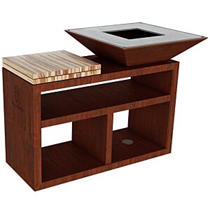 Le socle haut et spécialement prolongé permet de disposer d'une plus grande réserve de bois, d’un espace pour ranger la vaisselle, mais aussi d’avoir un billot de boucher à disposition. Préparez et servez facilement toutes vos spécialités directement depuis votre brasero.