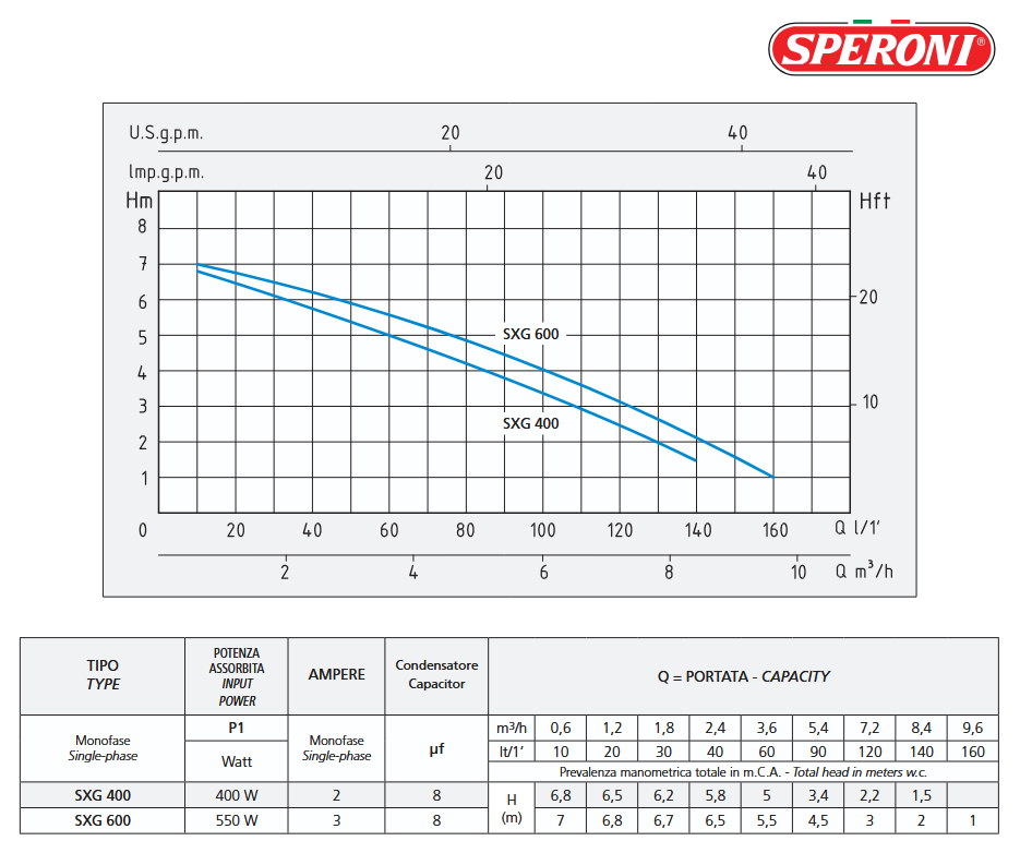 Pompes de relevage multi-usages modèle SXG 400 de la marque SPERONI électriques immergées en acier inoxydable portables. Utilisée pour drainer l'infiltration d'eau, la vidange de locaux inondés ou de réservoirs et de bassin, drainant les eaux usées propres ou légèrement sale, irrigation de jardins et de jardins.