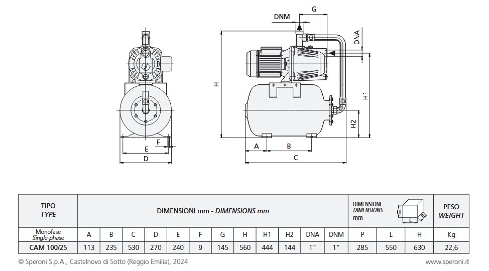 Surpresseur à vessie Press V CAM 100/25L HW 25 SPERONI