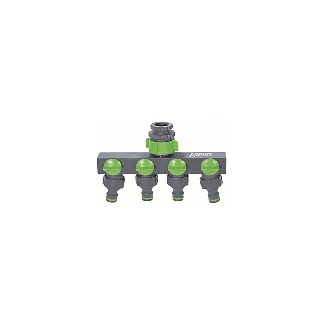 Nez de robinet avec des réductions en 1" (26x24mm), 3/4" (20x27mm) et 1/2" (15x21mm), un sélecteur 4 voies avec des sorties en 3/4" (20x27mm) équipées d'adaptateurs pour raccords rapides Ribimex et de vannes d'arrêt.