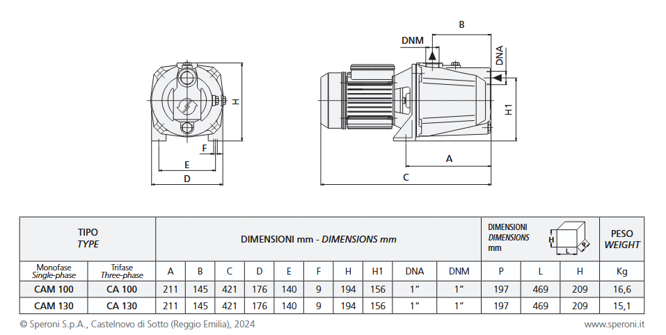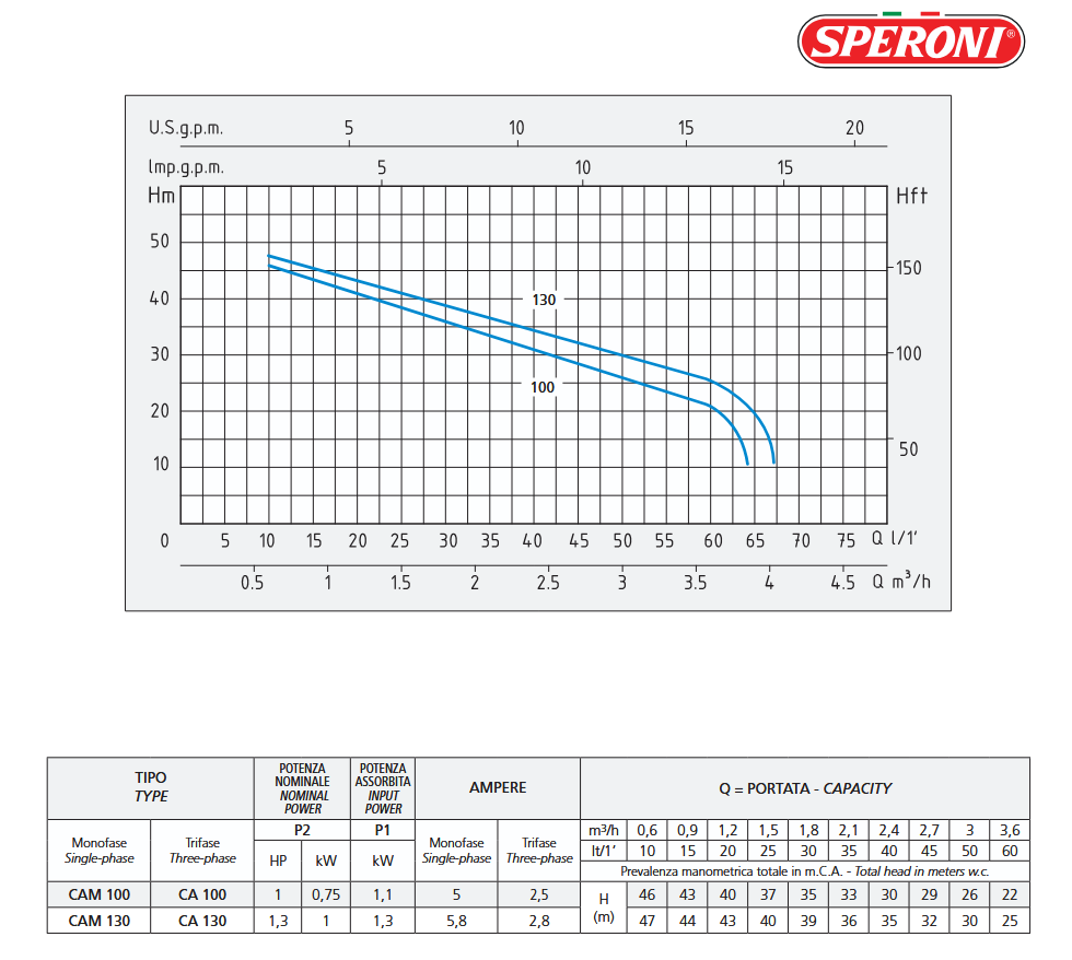La pompe électrique auto-amorçantes CAM 100 SPERONI offre d'excellentes performances hydrauliques et une capacité de pression remarquable. Elle peut aspirer jusqu'à 8 mètres de profondeur et elle est capable de fonctionner parfaitement même en présence d'eau mélangée à du gaz. Convient pour le levage et la distribution d'eau dans les systèmes domestiques avec des petits et moyens réservoirs.