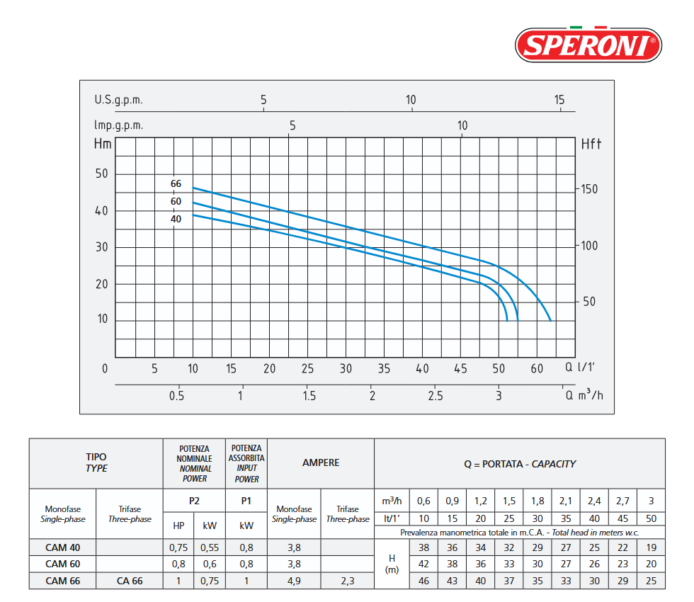 La pompe électrique auto-amorçantes CAM 40 SPERONI offre d'excellentes performances hydrauliques et une capacité de pression remarquable. Elle peut aspirer jusqu'à 8 mètres de profondeur et elle est capable de fonctionner parfaitement même en présence d'eau mélangée à du gaz. Convient pour le levage et la distribution d'eau dans les systèmes domestiques avec des petits et moyens réservoirs.